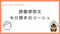 読書感想文サイト「DOKUSHO KANSOBER」の『セロ弾きのゴーシュ』あらすじ用アイキャッチ画像。オレンジ枠のデザインで、左下に目を閉じた少年、右下に本を読むキャラクターJUYIが配置されている。 名作・定番本